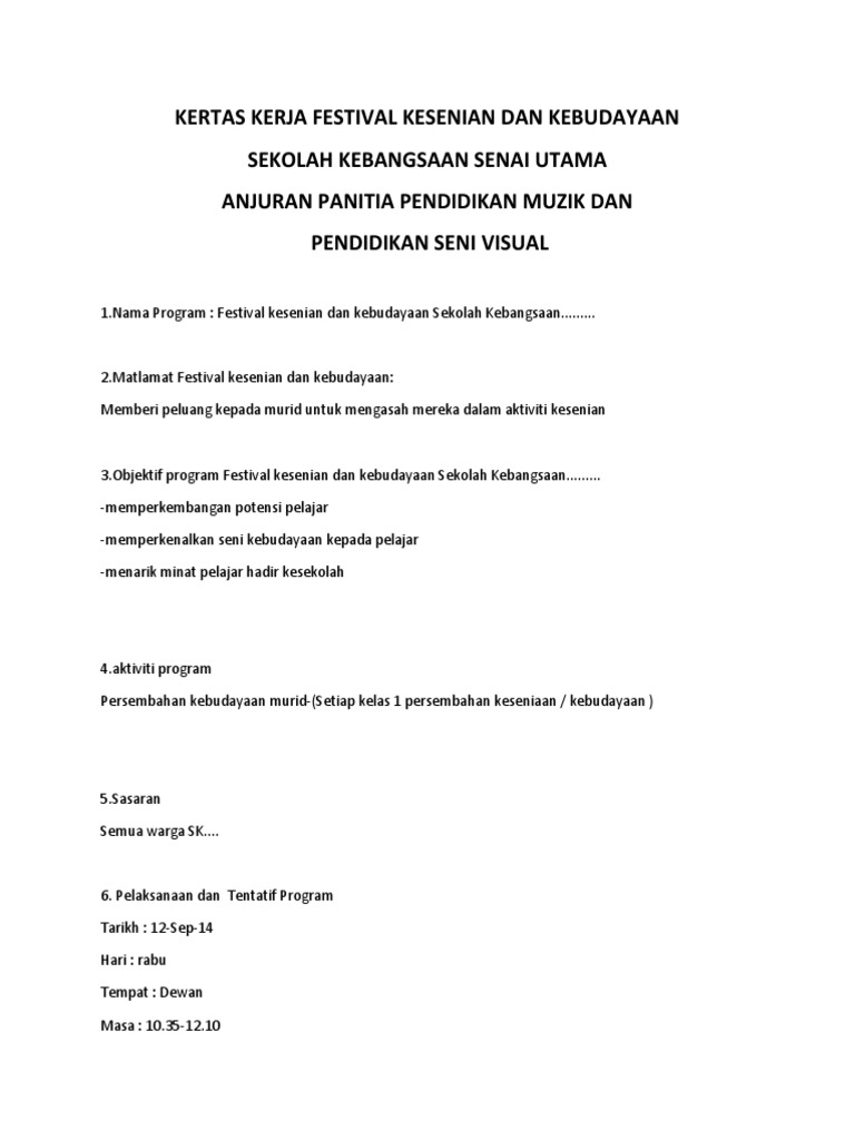 Kertas Kerja Festival Kesenian Dan Kebudayaan Peringkat Sksu 2019 Pdf